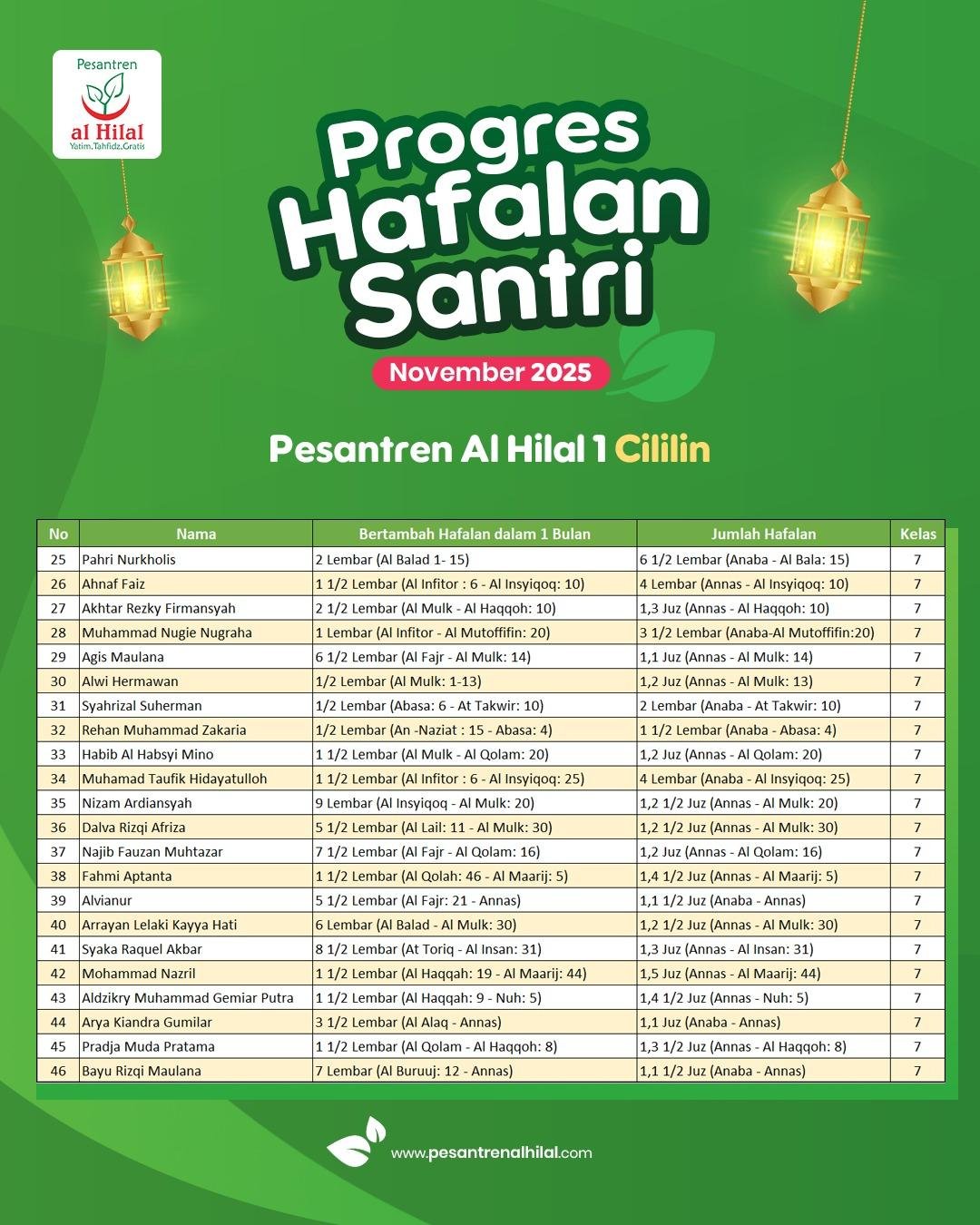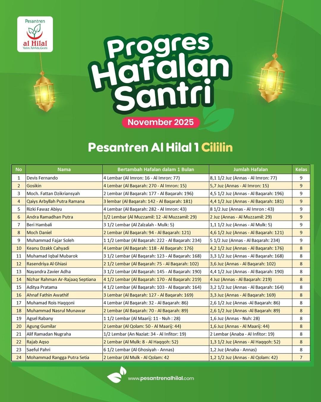 Alhamdulillah, di bulan November 2025 lalu, para Santri Yatim Penghafal Quran dari berbagai jenjang di lingkungan Pesantren Al Hilal kembali menunjukkan semangat yang luar biasa dalam menjaga dan meningkatkan hafalan Al-Qurannya. Mereka adalah:
